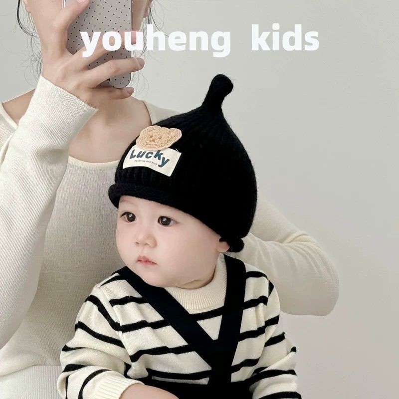 ins韩系宝宝帽子秋冬季保暖加厚针织奶嘴帽男女童护耳尖尖毛线帽