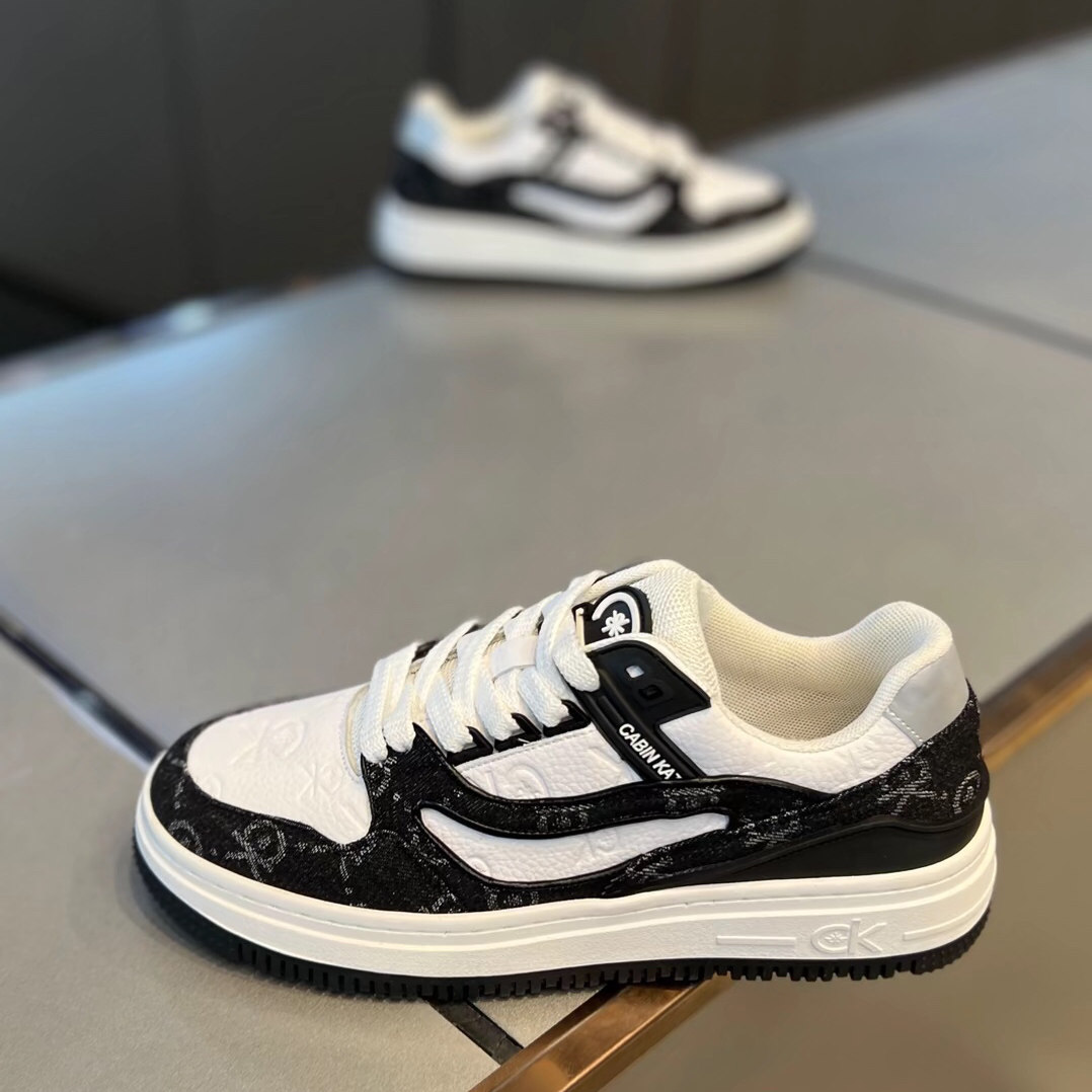 男鞋2024新款皮面印花板鞋黑色百搭舒适低帮系带圆头运动鞋休闲鞋