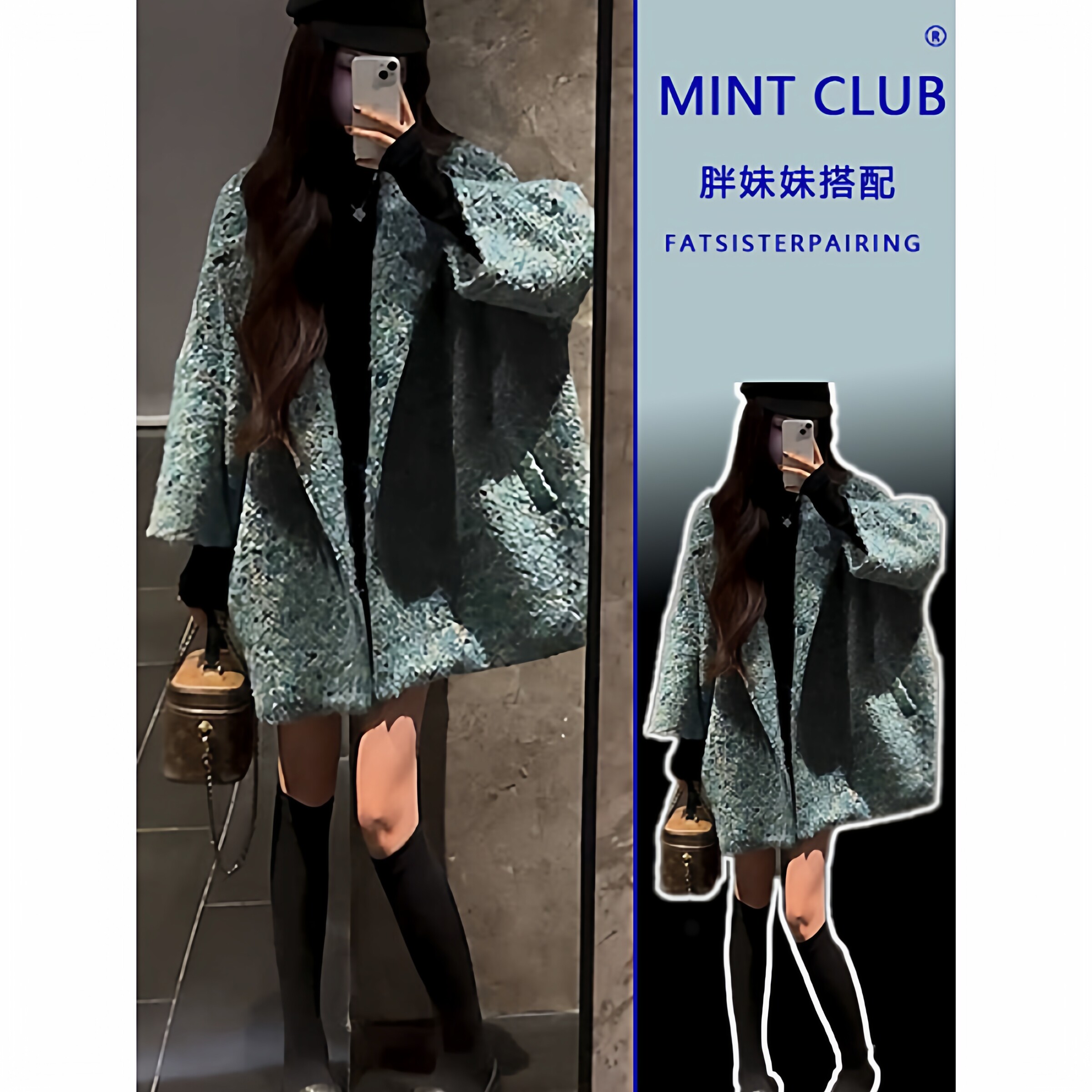 韩系小香风宽松毛呢大衣女秋冬新款大码胖妹妹气质休闲双面呢外套