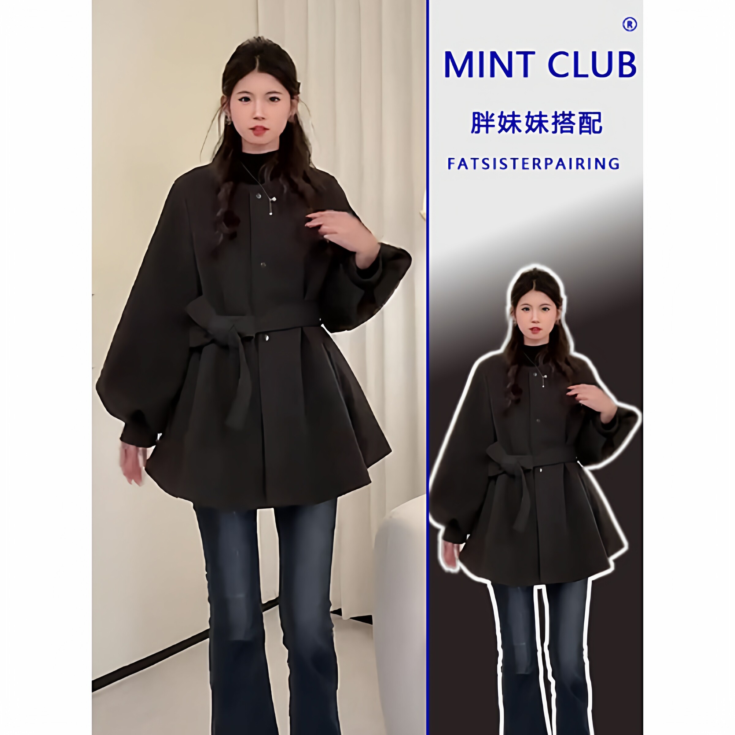 秋冬新款大码胖妹妹法式气质圆领灯笼袖毛呢外套系带收腰呢子大衣