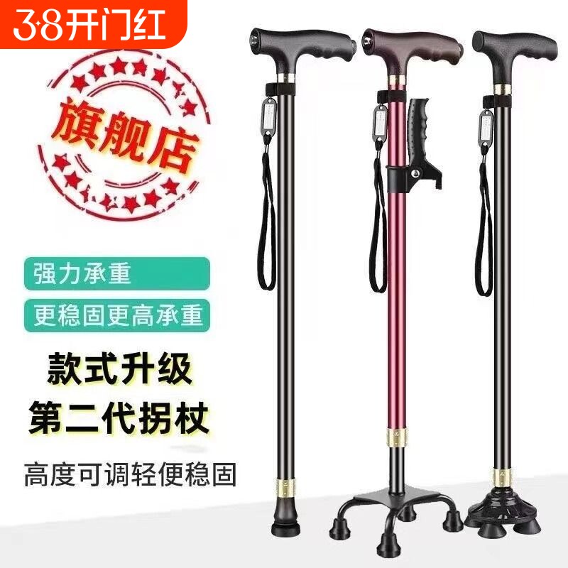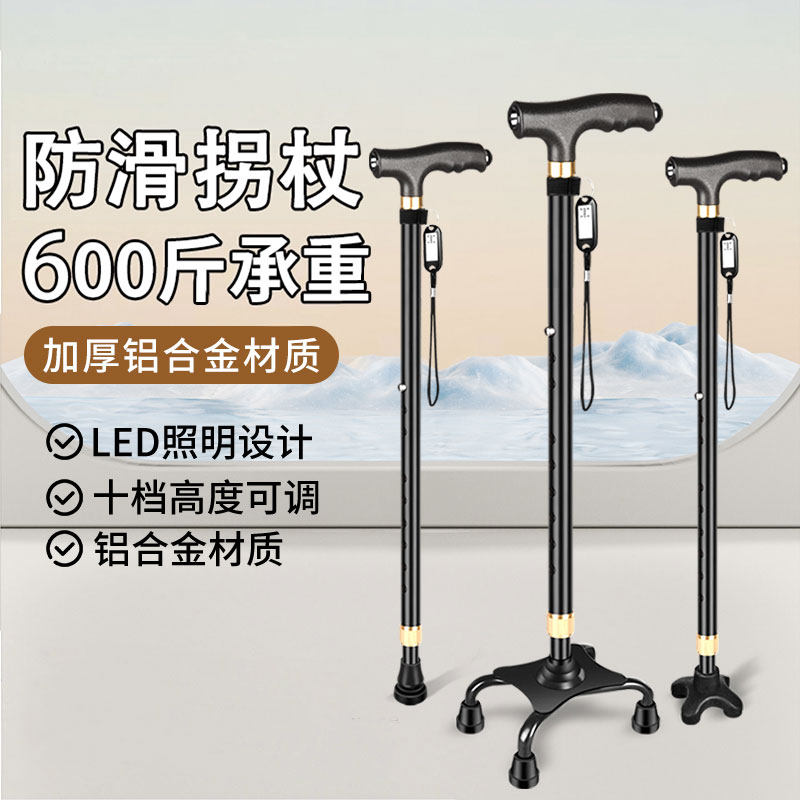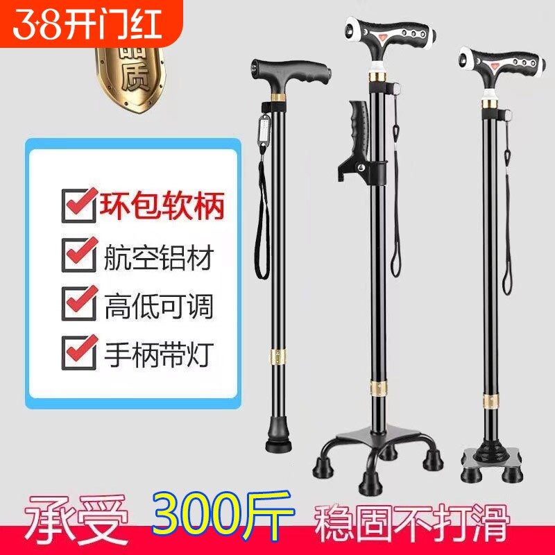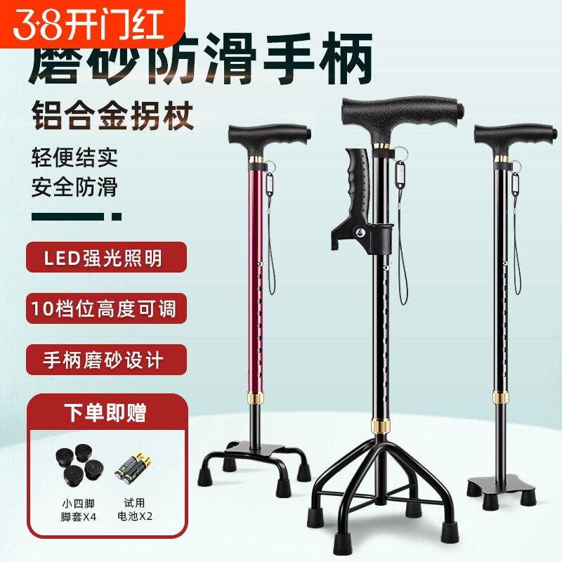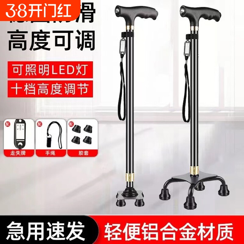 老人拐杖老年人专用拐棍四脚轻便防滑手杖防摔倒捌杖伸缩带灯登山