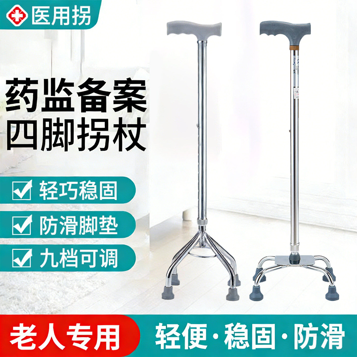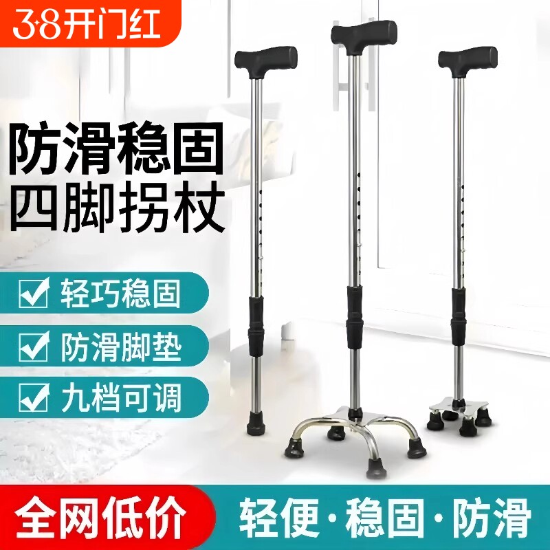 拐棍老人防滑拐杖四脚手杖不锈钢助行四角骨折轻便徒步助力铝合金