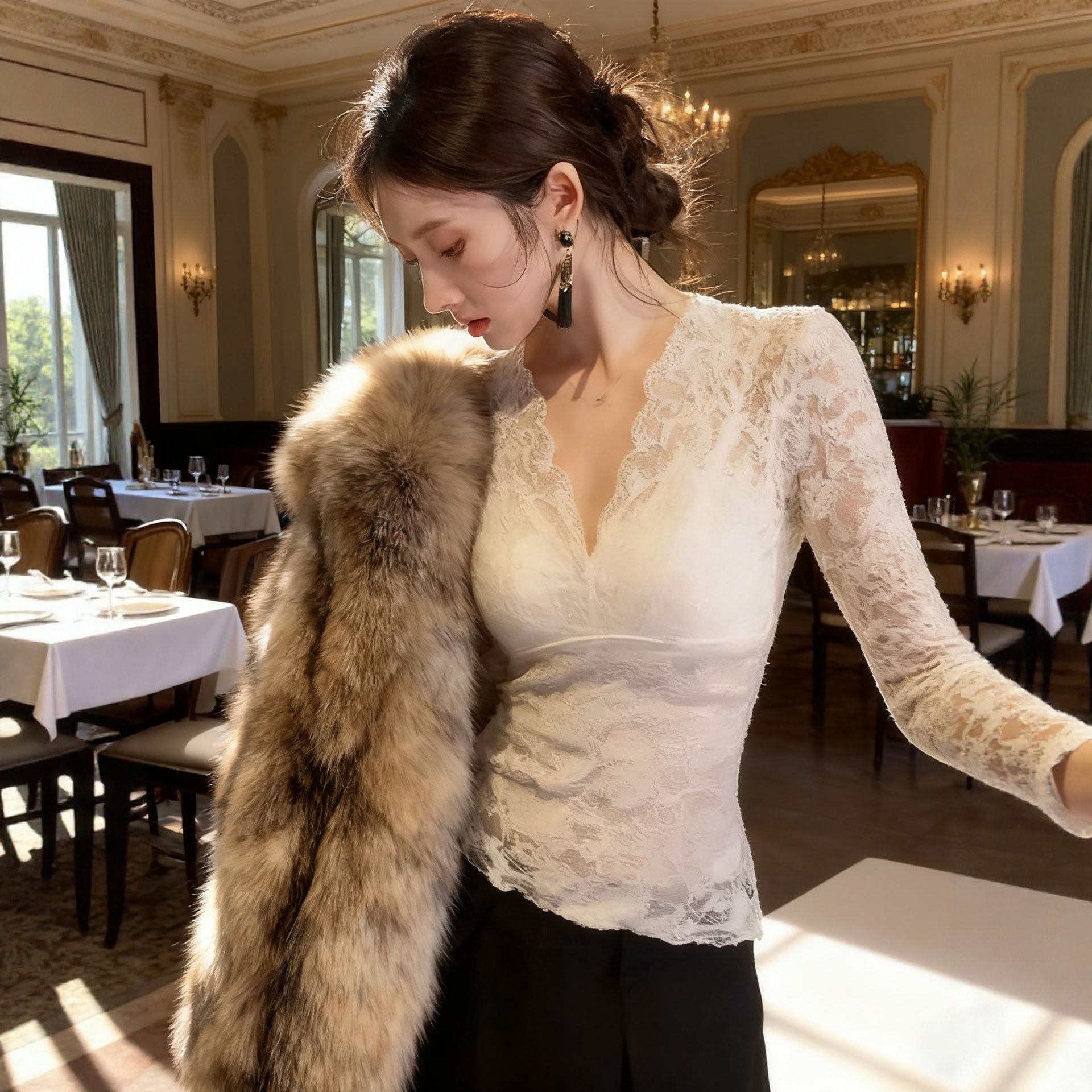 纯欲性感v领蕾丝打底衫女秋冬皮草内搭轻奢高级感独特别镂空上衣