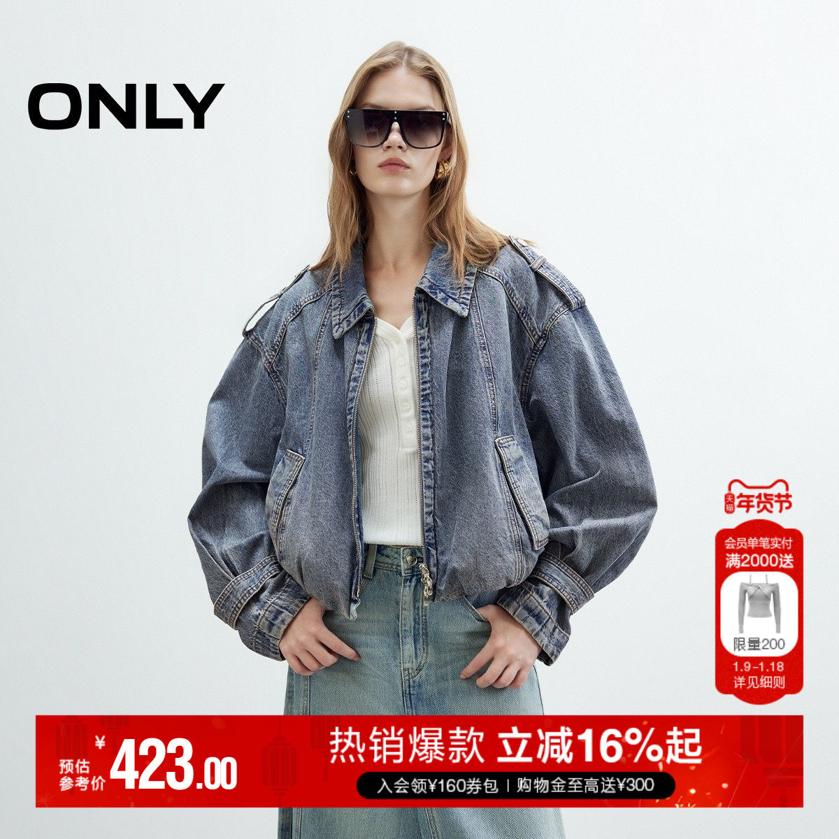 ONLY2025冬季新款个性做旧水洗落肩长袖宽松口袋翻领牛仔外套女