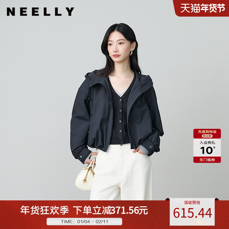 NEELLY纳俪商场同款秋冬新款宽松个性短款连帽风衣女廓形显瘦外套