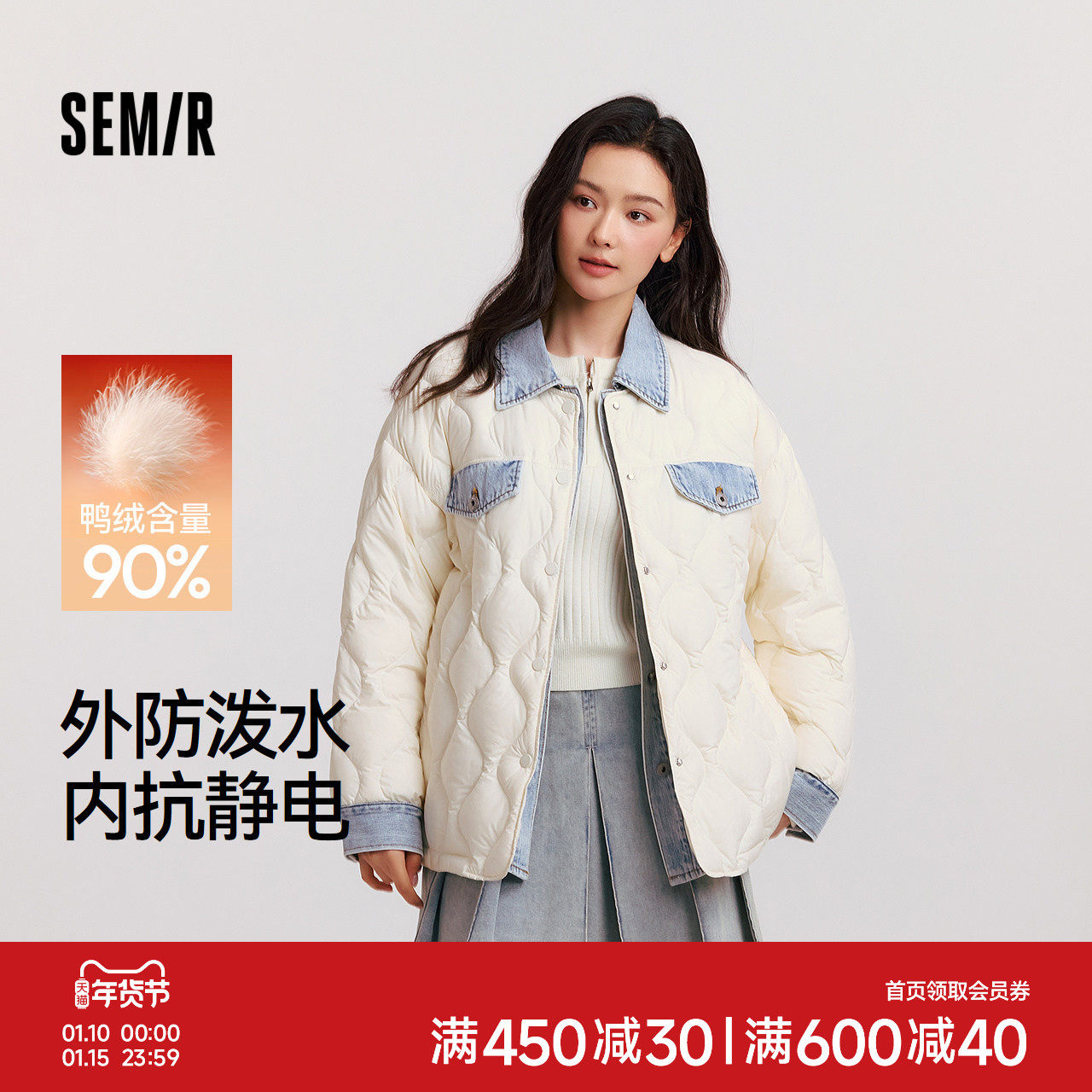 森马羽绒服女中长款防泼水拼接牛仔潮酷个性冬抗静电宽松轻薄外套