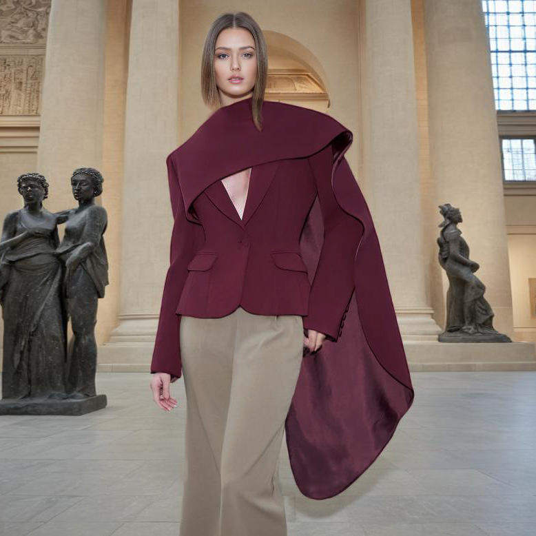 时尚个性外套女2025冬季潮流风拼接设计感红色披肩小西装纯色长袖
