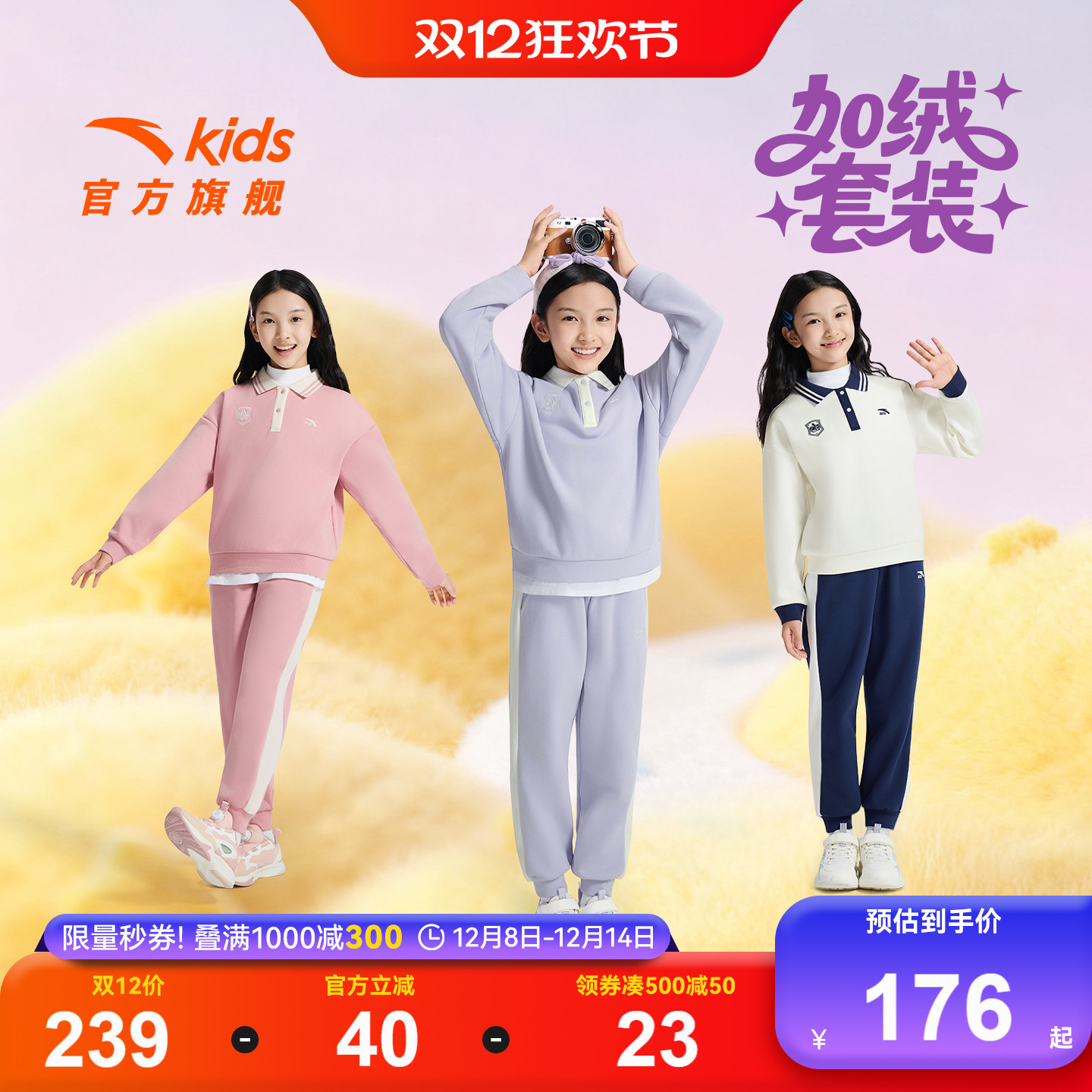 安踏儿童装女童针织运动套装加绒2025冬款舒适时尚卫衣裤子两件套
