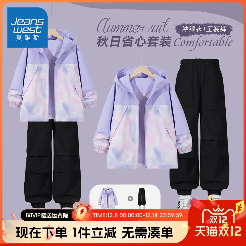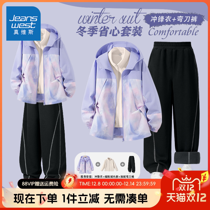 真维斯童装女童套装秋冬款儿童加绒防水冲锋衣女大童运动两件套暖