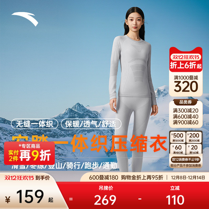 安踏一体织滑雪压缩衣抗菌保暖内衣女冬季户外登山两件套运动套装