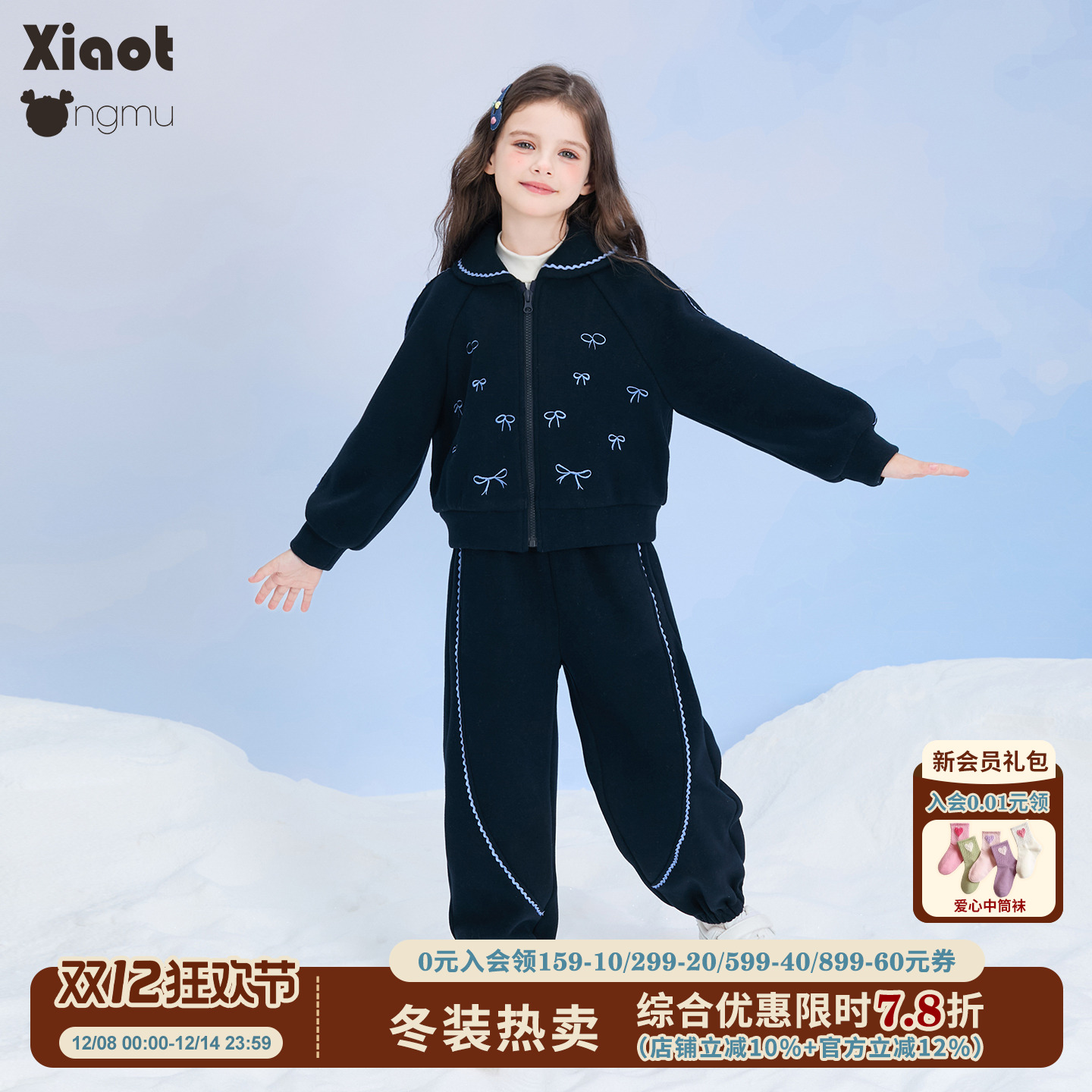 小童木 学院藏青女童运动套装冬季新款中大童刺绣卫衣卫裤两件套