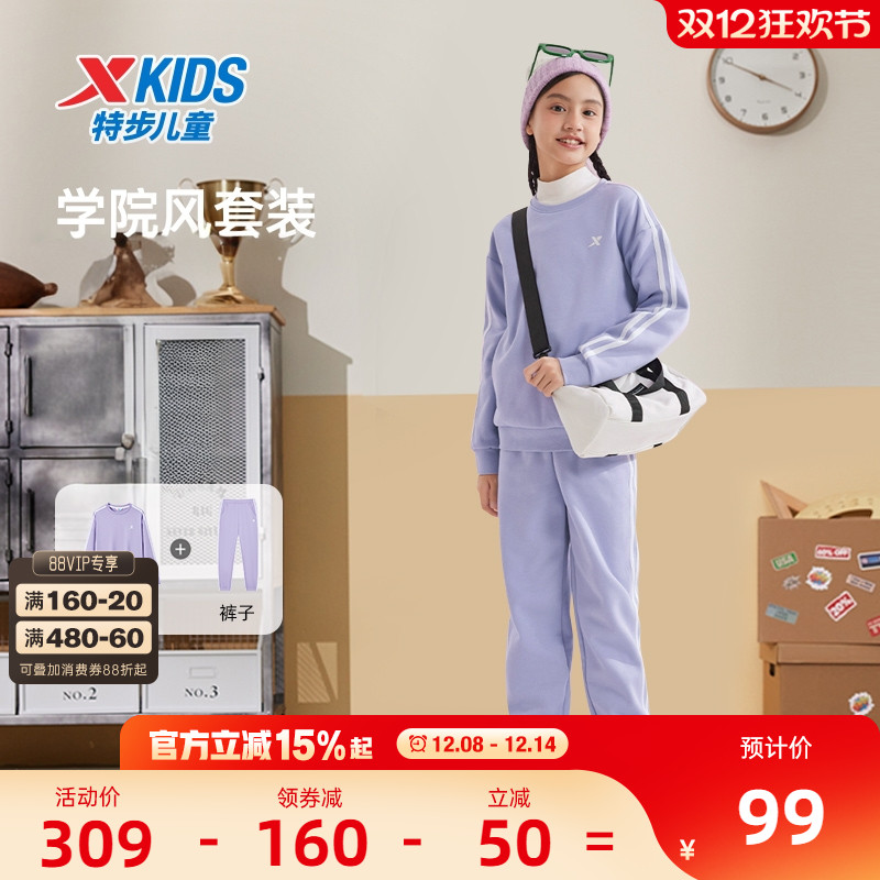 特步童装女童圆领运动服套装2025秋冬新款运动套头卫衣长裤两件套