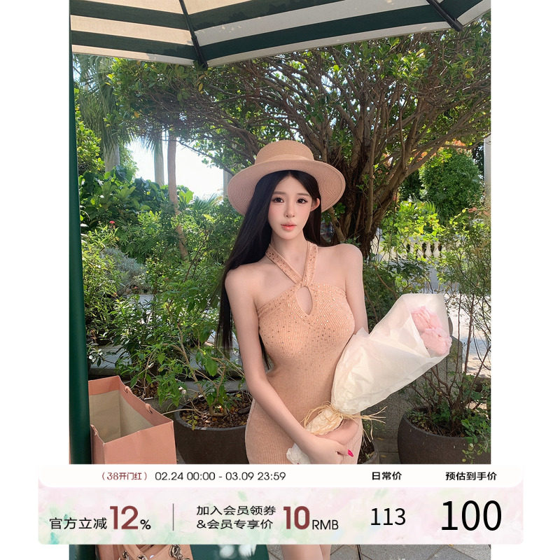 项天鹅er 针织挂脖连衣裙女2026早春新款纯欲镂空包臀裙露肩裙子