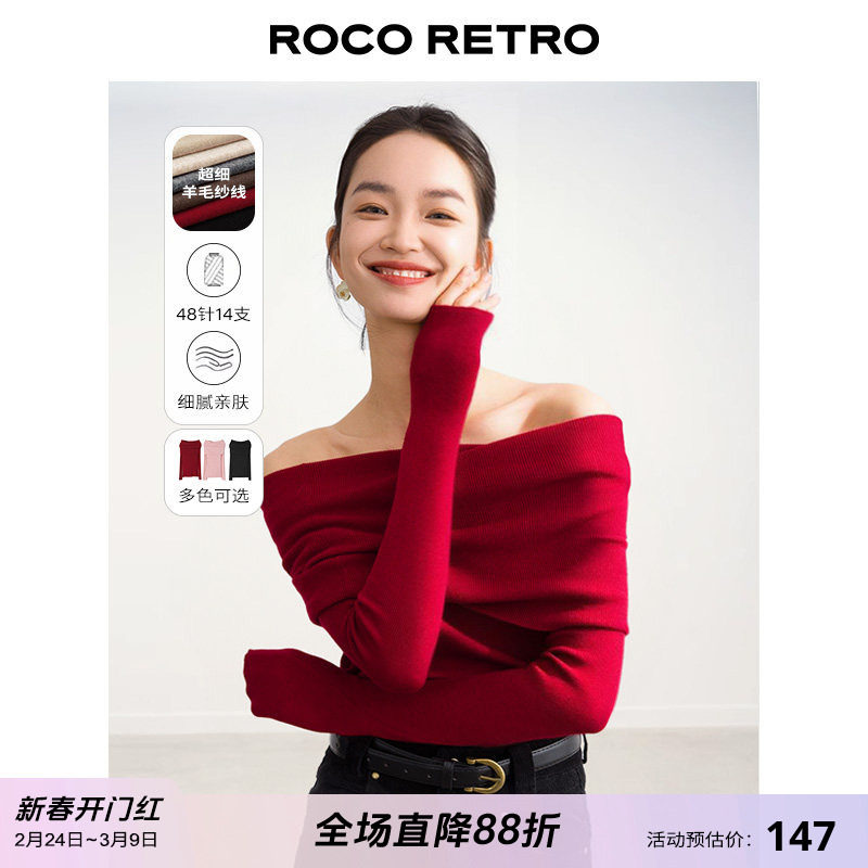 ROCO 新年战衣 绝美羊毛一字肩露肩针织衫女长袖红色高级感毛衣