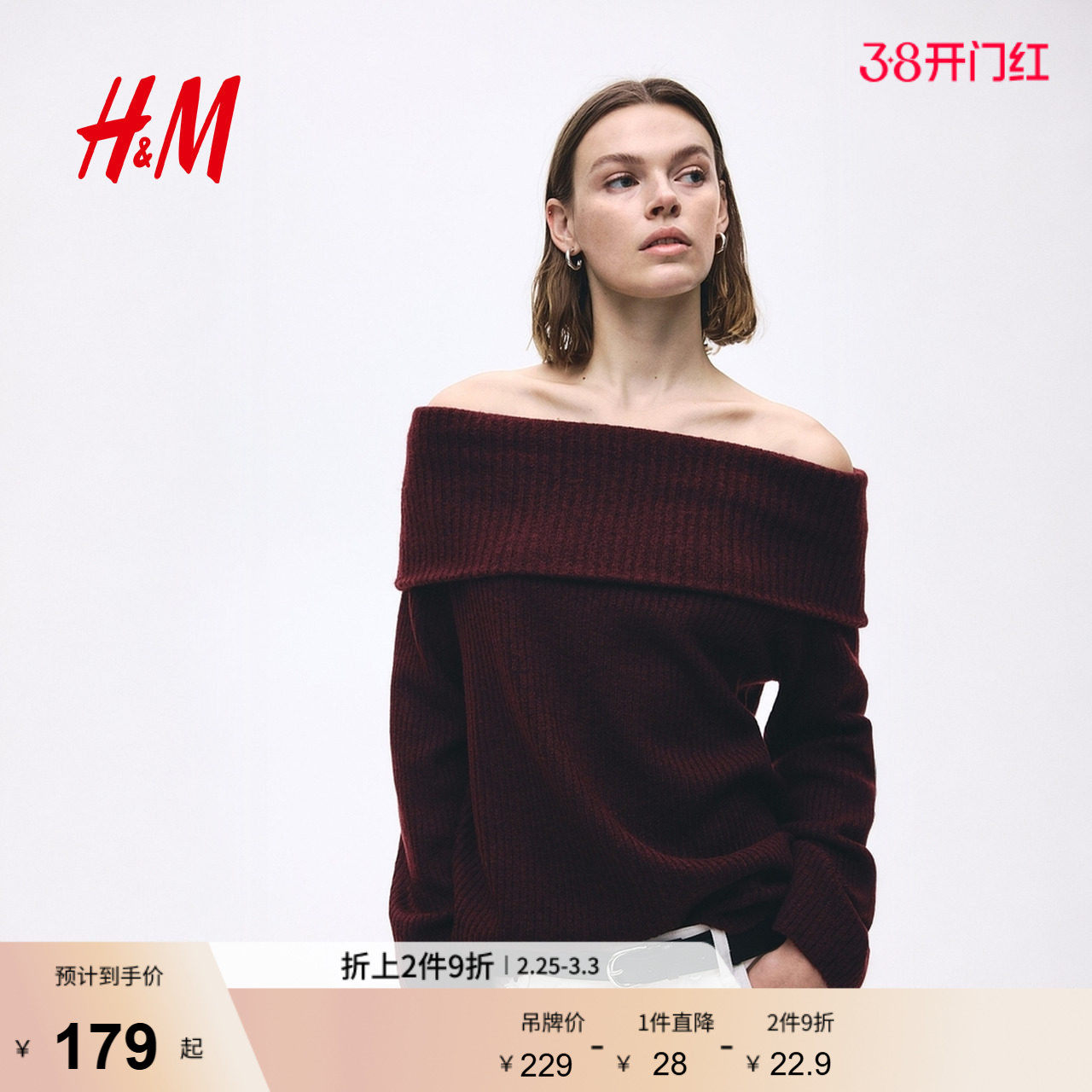 HM女装毛针织衫春季露肩宽松内搭气质酒红色打底衫1294589