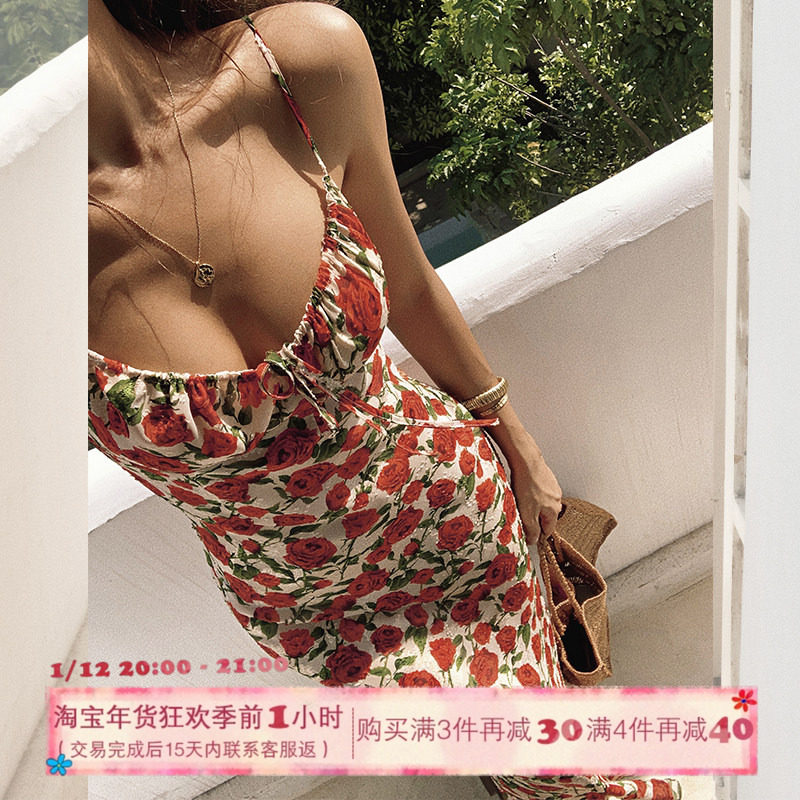 ITSNIKAR法式玫瑰碎花连衣裙女秋复古红色吊带裙海边度假修身裙子