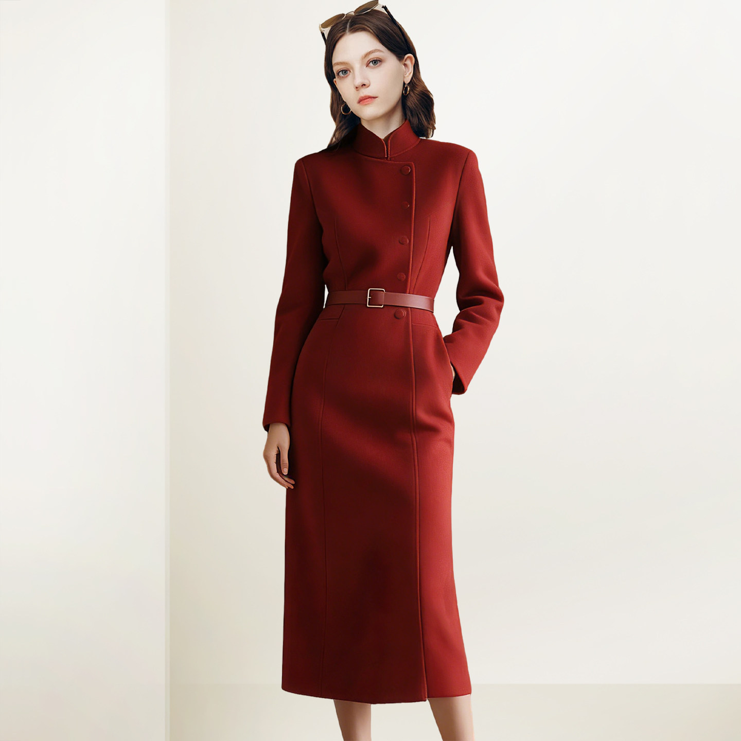 菲梦伊红色连衣裙女长袖秋装别致设计感修身双排扣气质中长款大衣