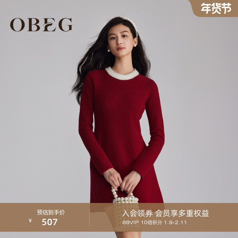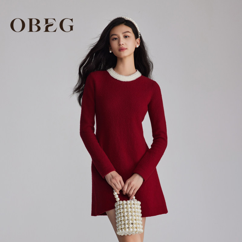 OBEG欧碧倩复古红色羊毛针织连衣裙女冬季a字修身内搭裙10484155