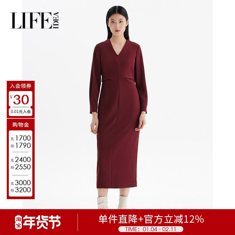 莱芙艾迪儿时尚经典简约百搭V领红色连衣裙女修身显瘦精致连衣裙
