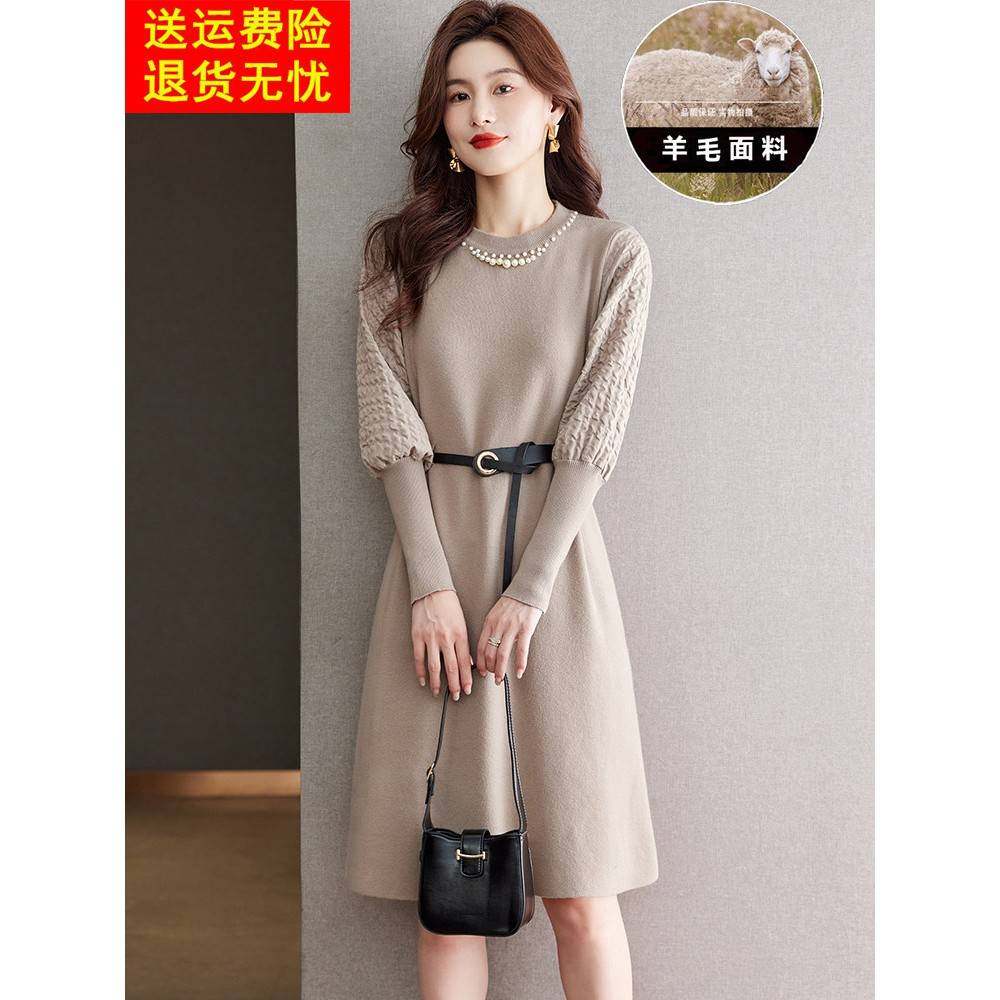 羊绒羊毛衫咖色毛衣裙女士2024年冬季新款针织过膝连衣裙打底衫厚