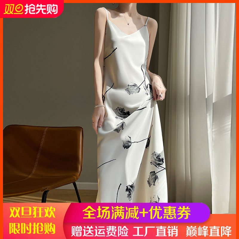 夏季女士真丝碎花吊带连衣裙v领a字裙子气质显瘦内搭无袖长裙长款