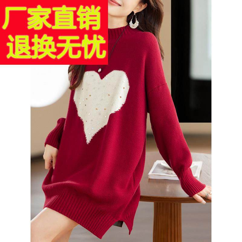 2025冬季新款爱心提花亮片跨年红色毛衣中长款开叉洋气连衣裙女士