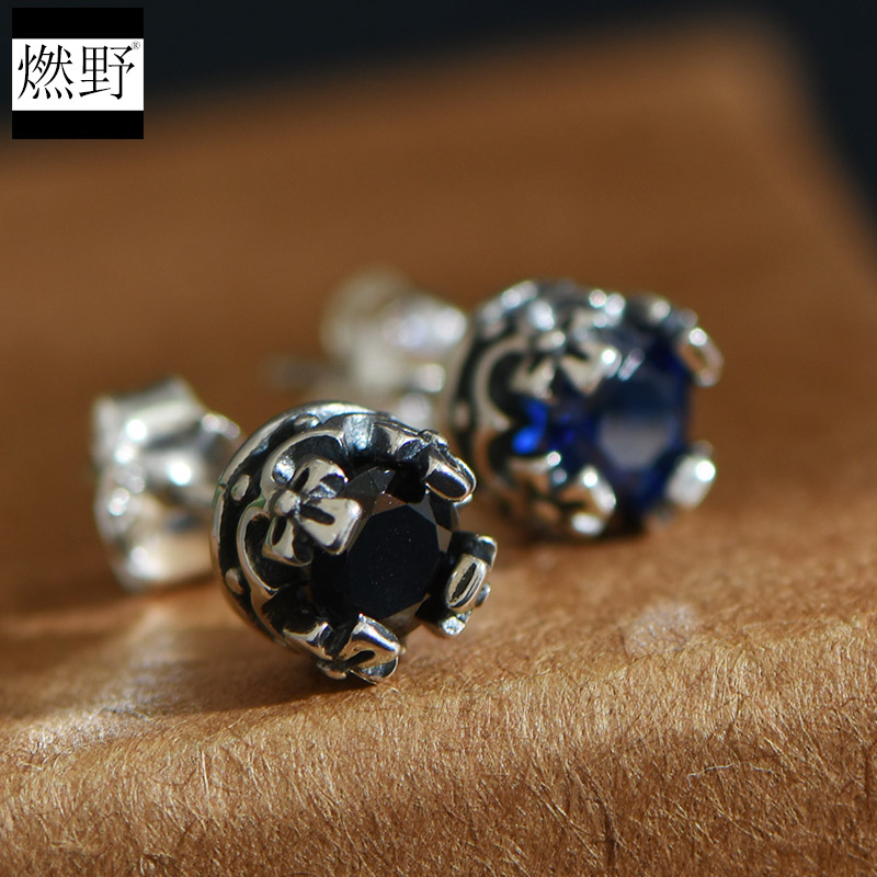 纯银男耳钉单只个性黑色潮男蓝色耳饰学生复古男朋友耳环生日礼物