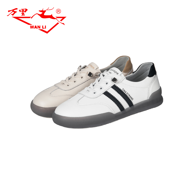 万里新款真皮平底小白鞋舒适休闲单鞋百搭圆头系带女鞋BUT2217
