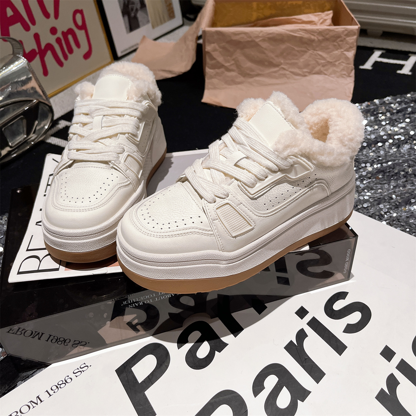 欧洲站真皮系带羊羔毛毛鞋休闲鞋板鞋擦色小脏鞋小白鞋平底鞋女鞋