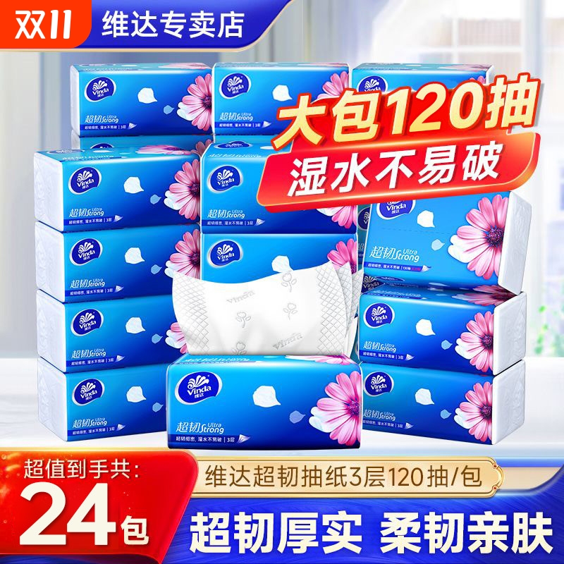 维达卫生纸纸巾抽纸餐巾纸超韧3层120抽24包超大包面巾纸纸抽批发