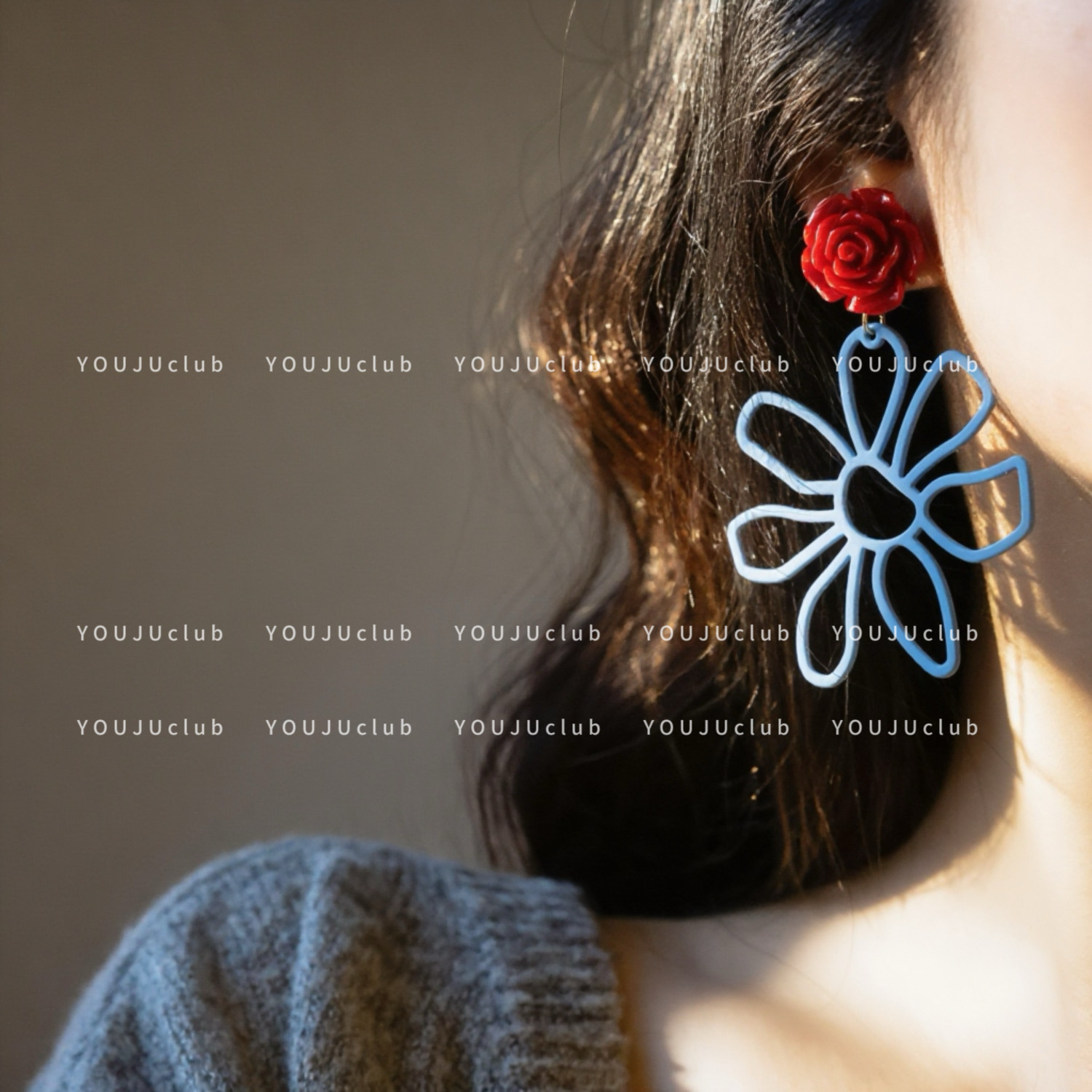YOUJUclub-方圆脸天菜~复古红蓝色夸张镂空大花朵耳环蚊香盘耳夹