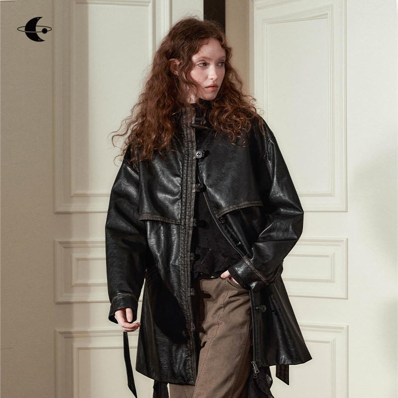 创世纪元【斑驳印记】秋季皮衣夹克外套女酷飒风新款大衣长款风衣