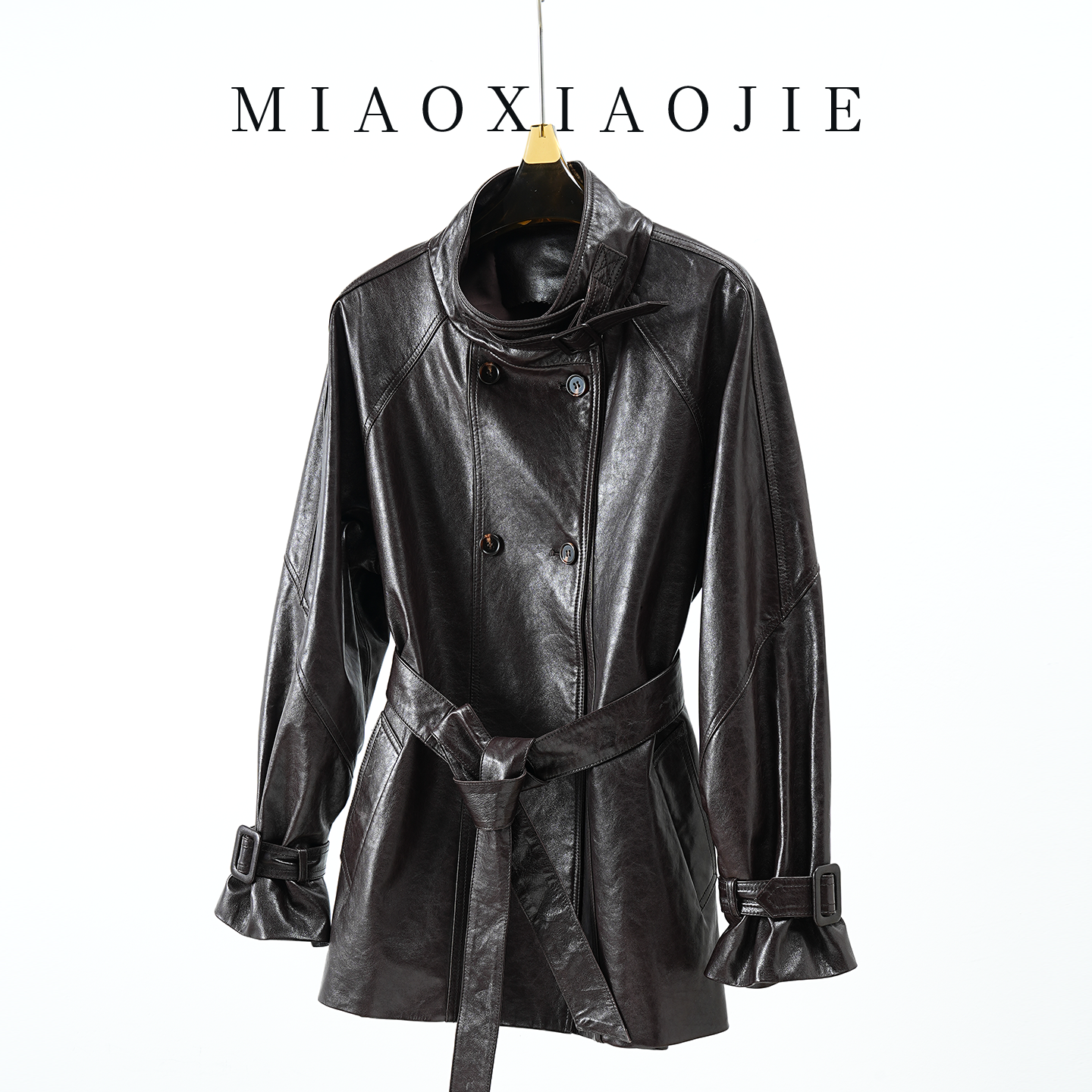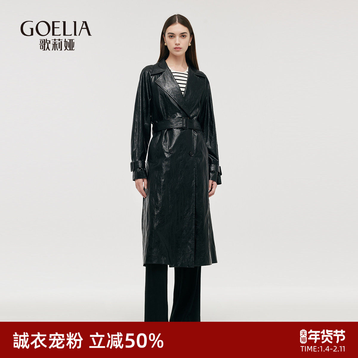 [甄选4折]NanaJacqueline廓形皮质长大衣风衣外套女气场感含腰带