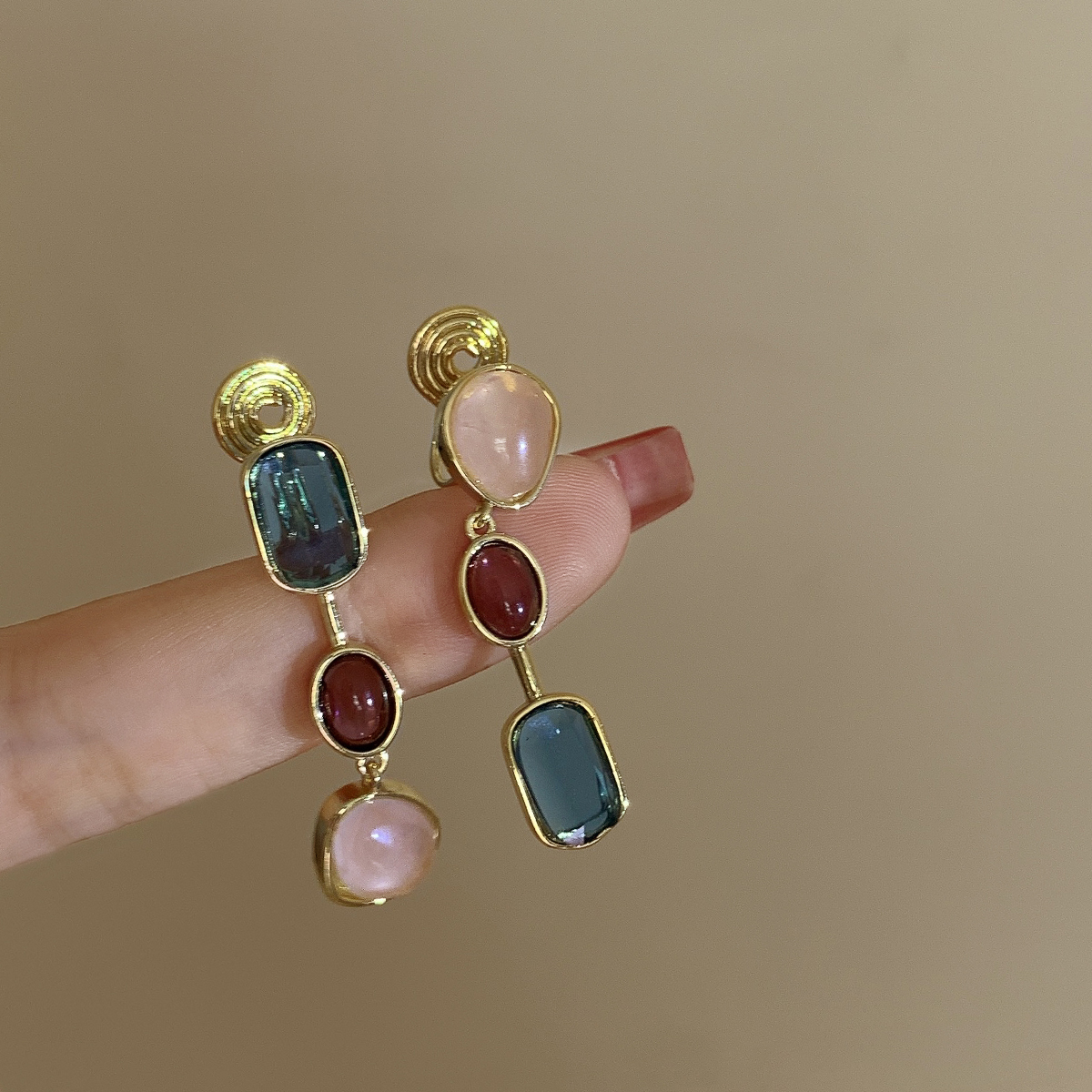 韩国不对称三彩宝石耳钉女耳夹无耳洞纯银耳环2026新款爆款耳饰