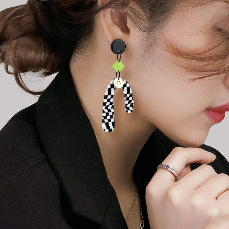 夏天清新绿夸张耳环一长一短不对称棋盘格耳饰韩国辣妹度假耳坠女