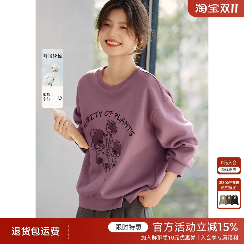 XWI欣未植物刺绣花朵字母印花卫衣女2025年秋季今年流行紫色上衣