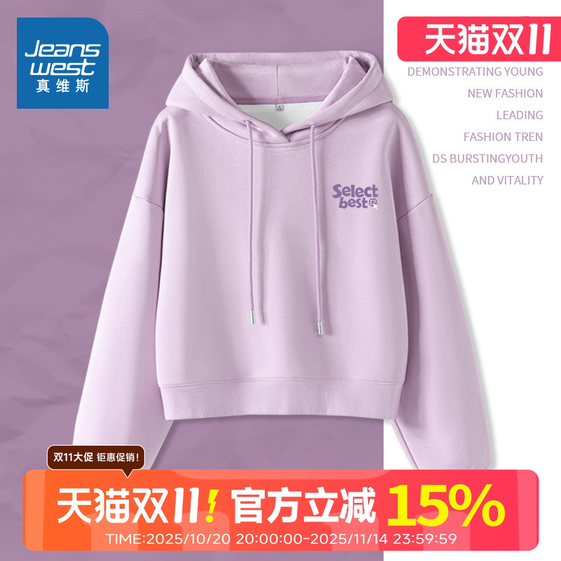 KMV真维斯紫色卫衣女2025新款秋冬季短款小个子连帽加绒宽松外套