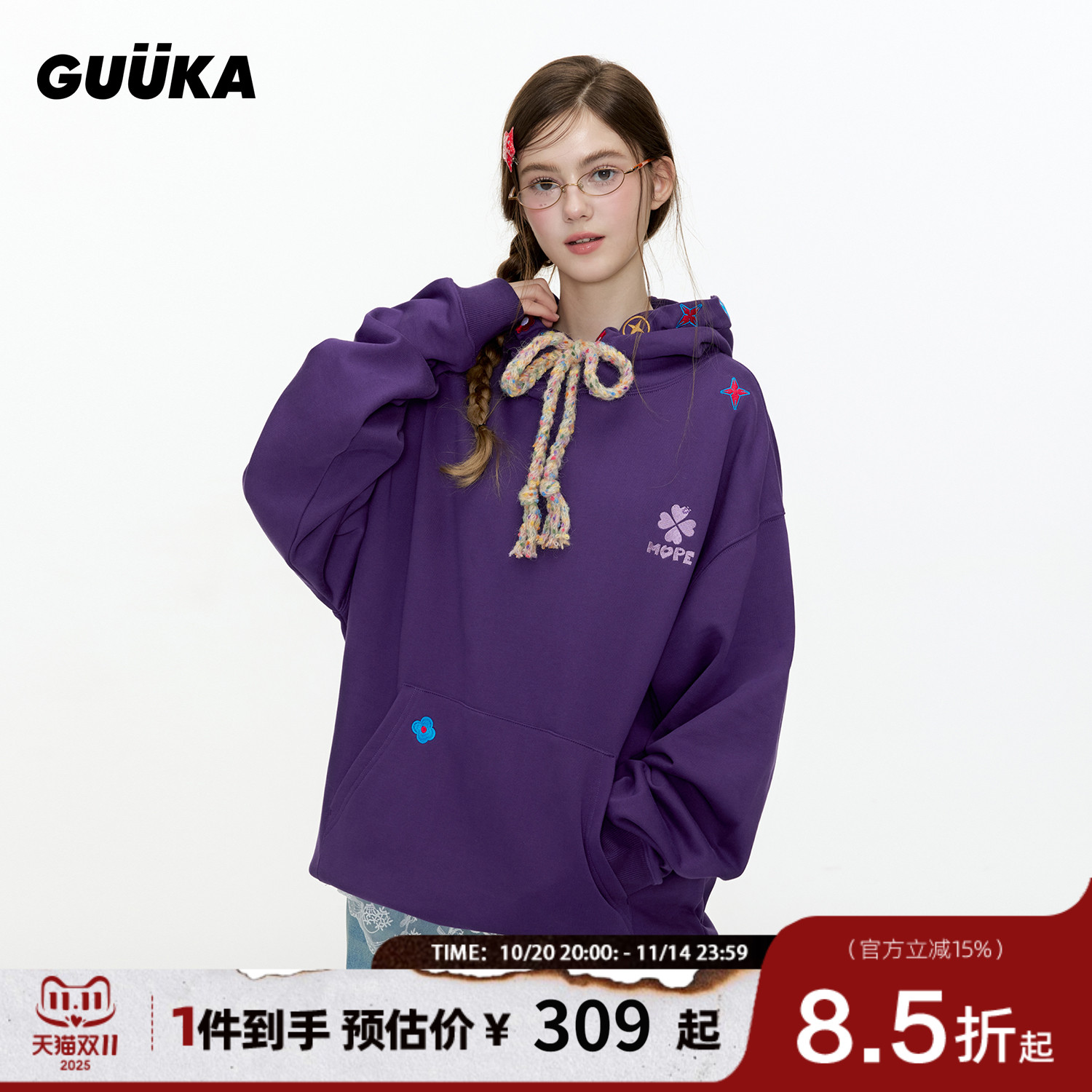 GUUKA潮牌花卉刺绣深紫色卫衣女 重磅纯棉加绒连帽衫落肩上衣宽松