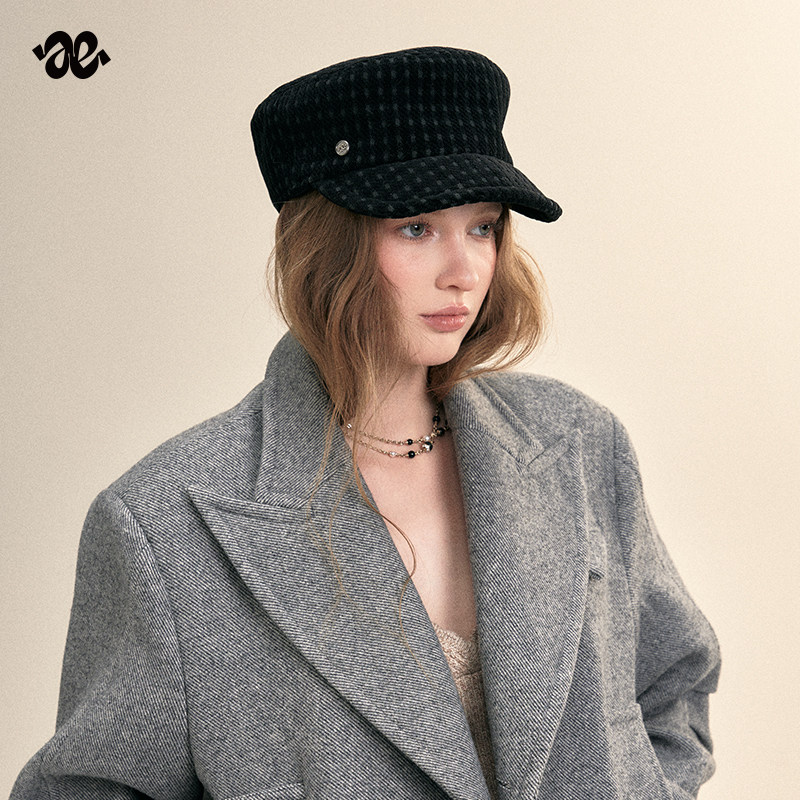 Amoge 复古千鸟格马术帽女206新款春秋毛绒保暖骑士帽鸭舌帽