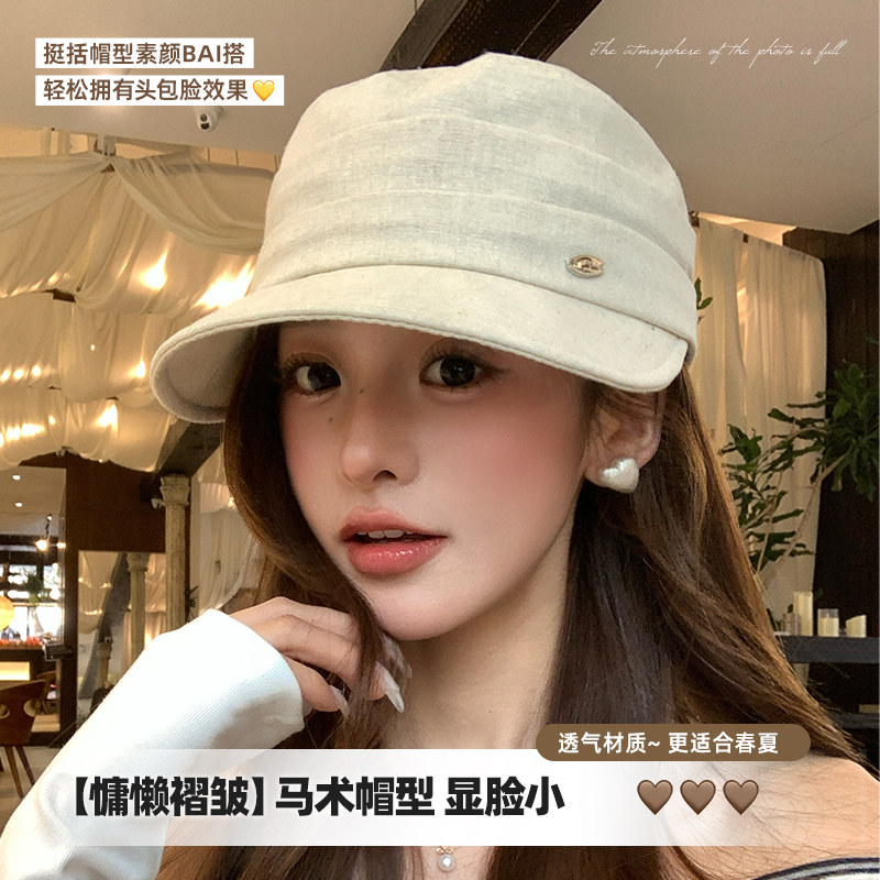 复古褶皱马术帽女秋季平顶贝雷帽子显脸小2025新款时尚洋气画家帽