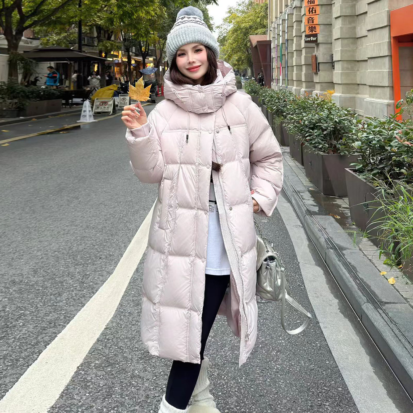 2025新款粉色羽绒服女中长款连帽过膝加厚韩版白鸭绒外套女棉服女