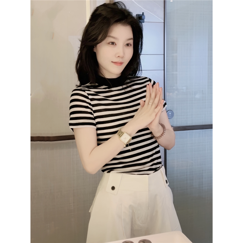 经典条纹针织短袖t恤女夏季24新款修身显瘦半高领打底衫内搭上衣