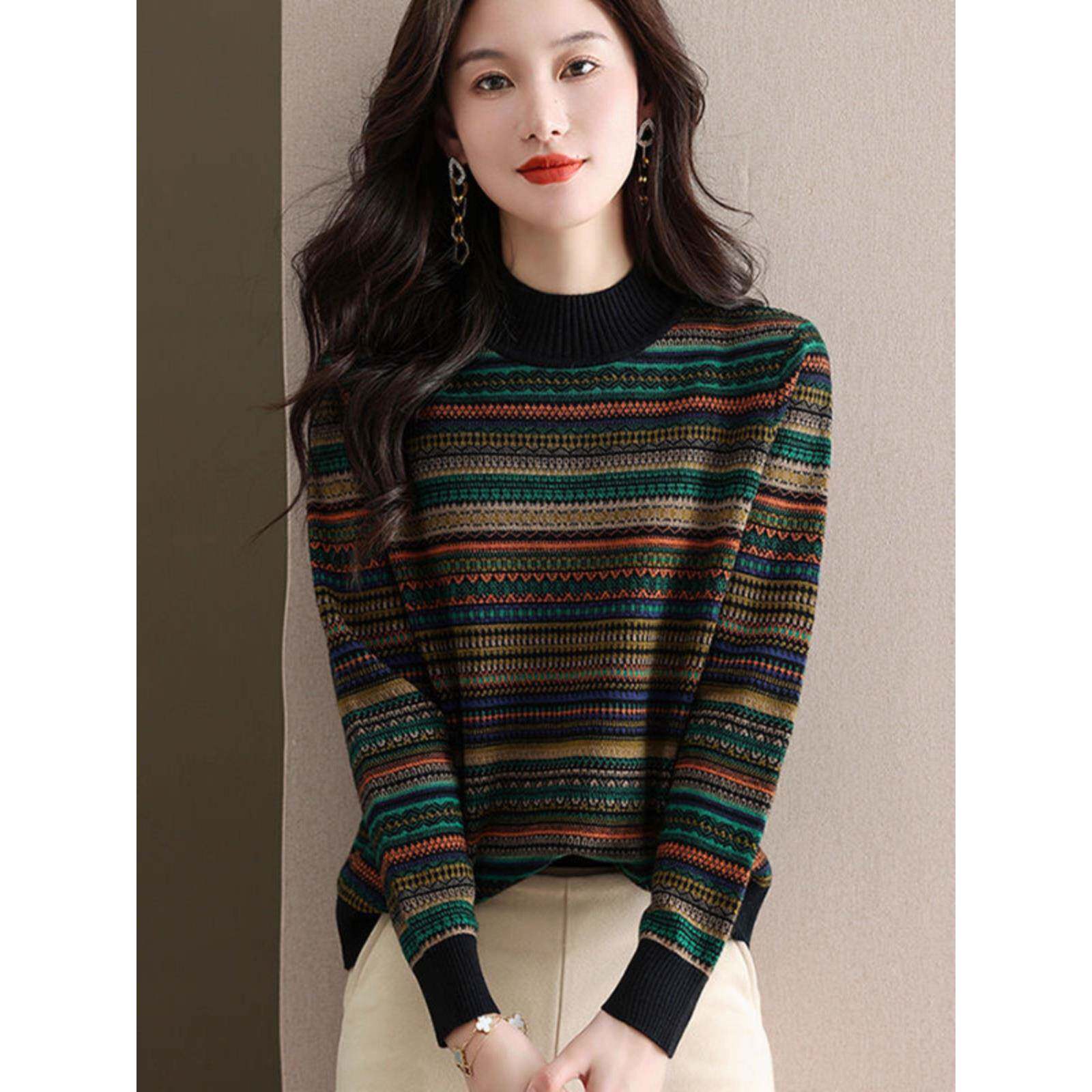 秋冬100%羊毛衫女半高领条纹拼色提花加厚针织上衣宽松打底羊绒衫