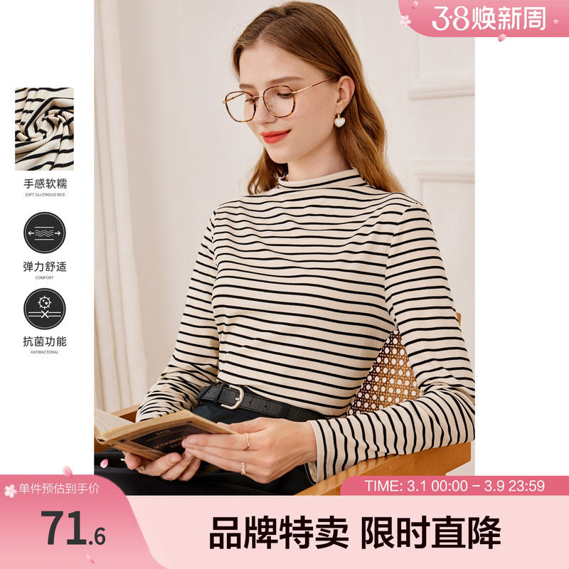 佐丹奴条纹T恤女2026年春纯棉修身打底衫半高领长袖T恤女05325860