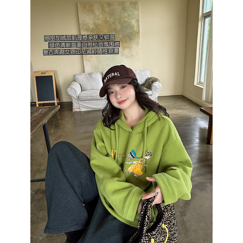 加绒棉感美式复古奔跑女孩印花绿色连帽文艺宽松百搭卫衣安妮森林