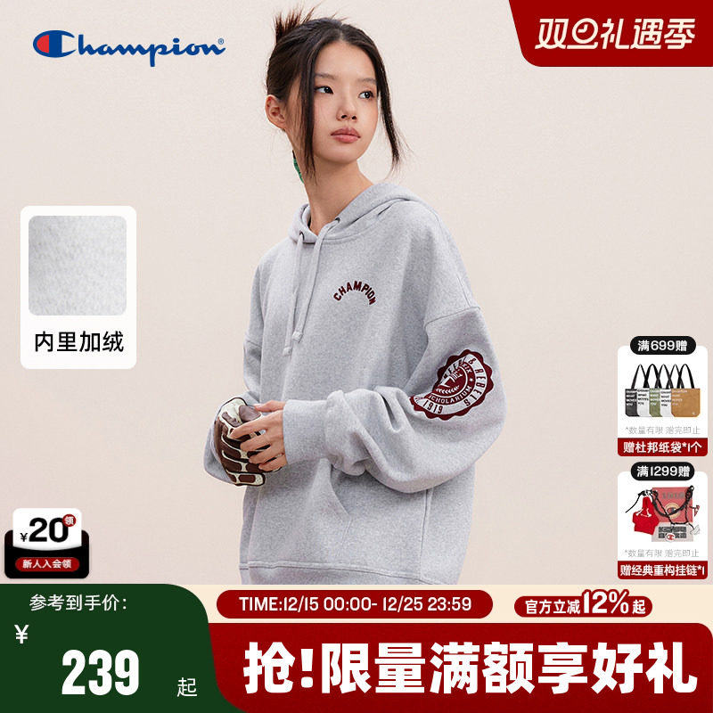 Champion冠军连帽卫衣女秋季新款红色本命年复古保暖加绒冬季潮