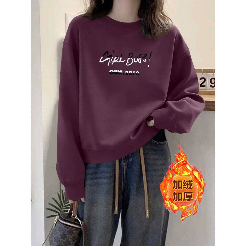 休闲无帽套头加绒加厚卫衣女2024新款韩版宽松小个子圆领上衣外套