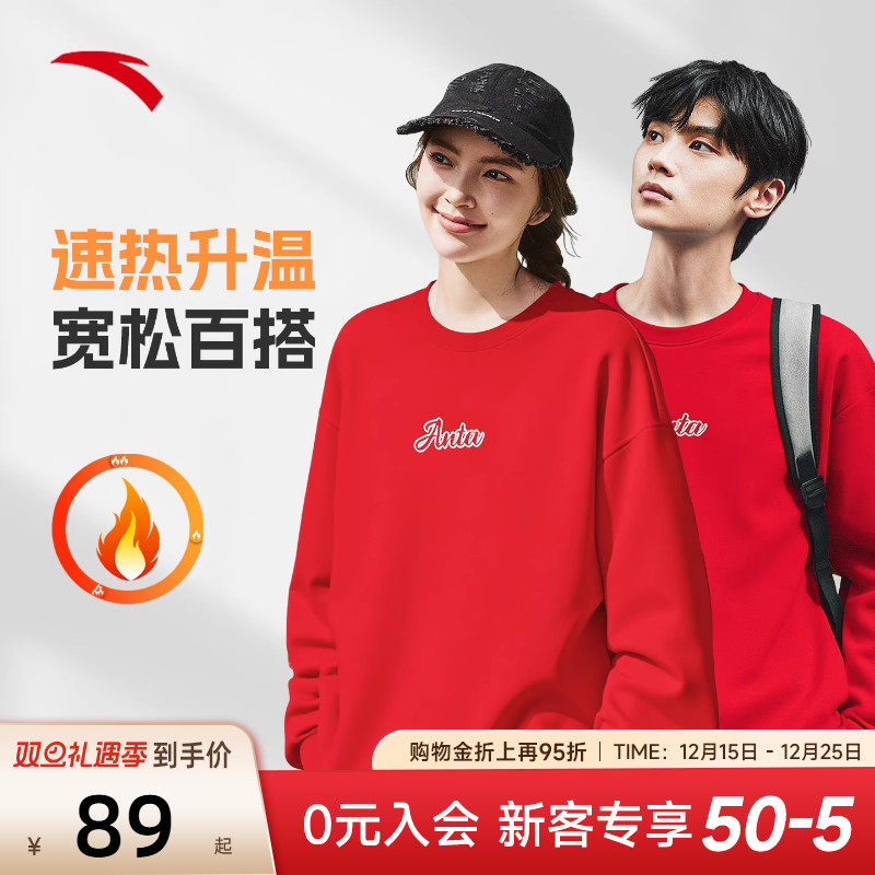 安踏红色卫衣冬季情侣加厚加绒保暖新年本命年套头衫男运动上衣女