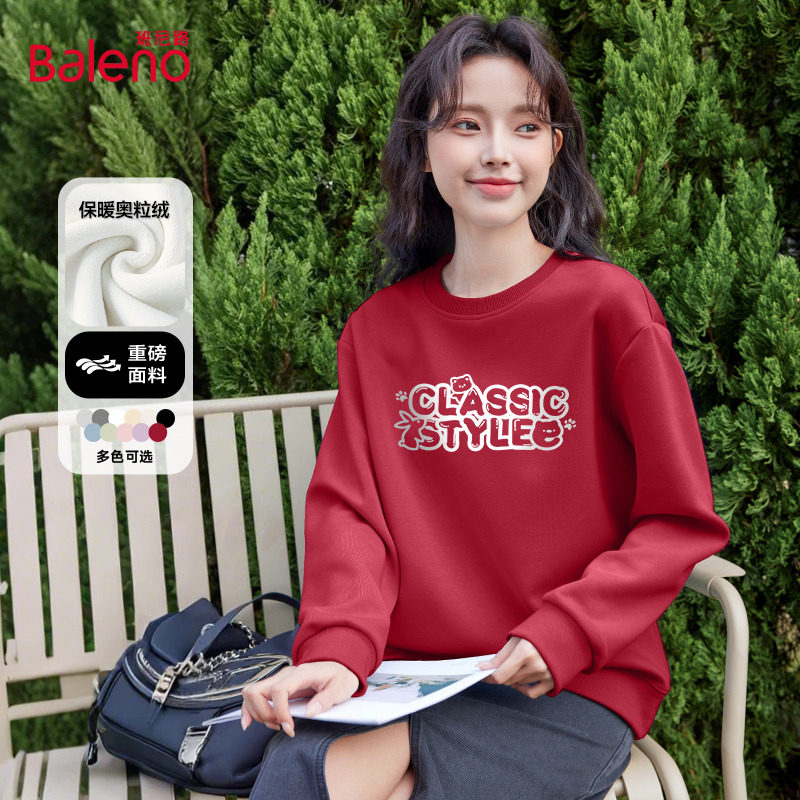 班尼路红色圆领加绒卫衣女款2025秋冬新款字母印花潮流百搭上衣Q