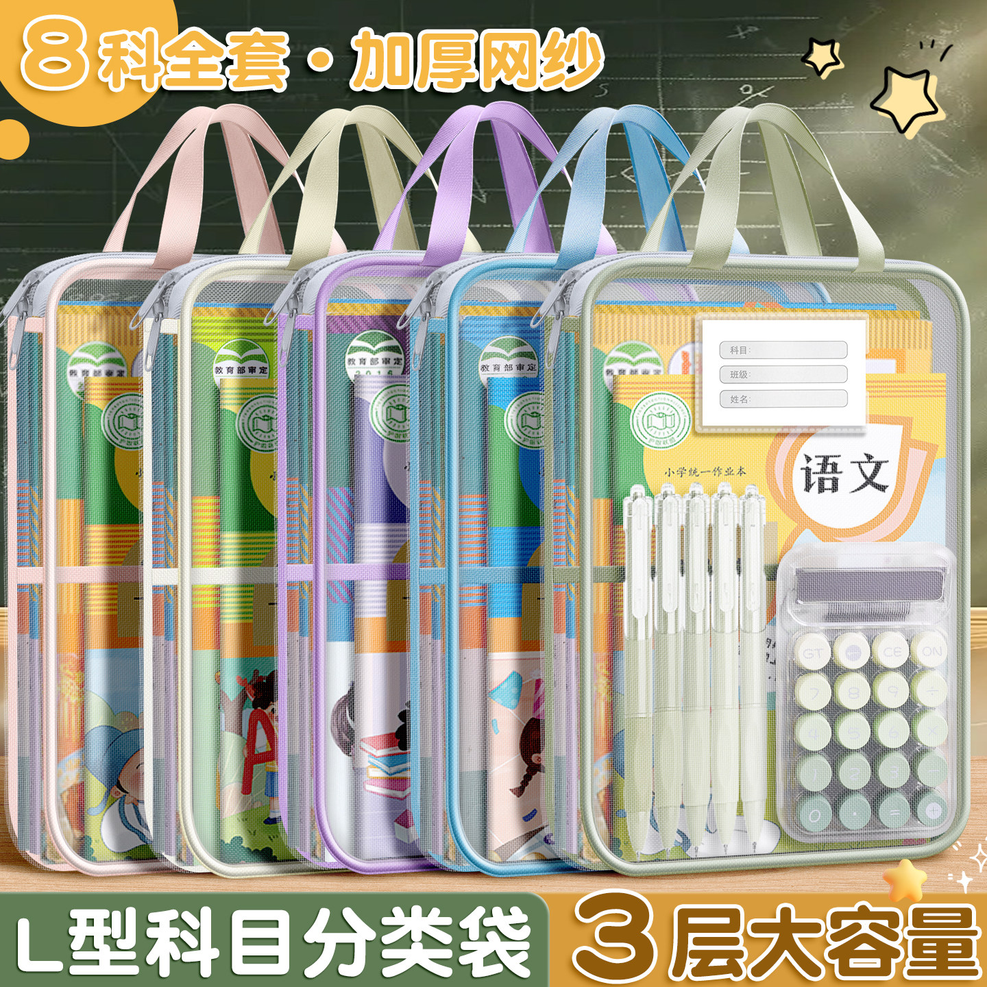 学科科目分类文件袋小学生拉链式用大容量书本书袋试卷收纳袋学生装资料袋子作业A4透明网纱手提书包开学双层